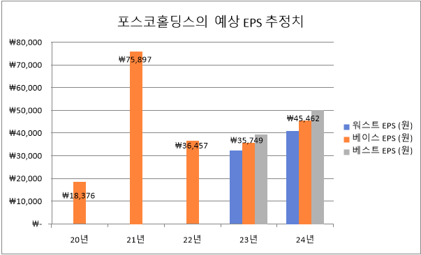 포스코홀딩스 2020년부터 2024년2020년까지 EPS가 연평균 15% 이상 증가할 것으로 예상합니다. 따라서 최상의 시나리오에서 EPS 증가율을 15%로 가정하고 계산합니다.